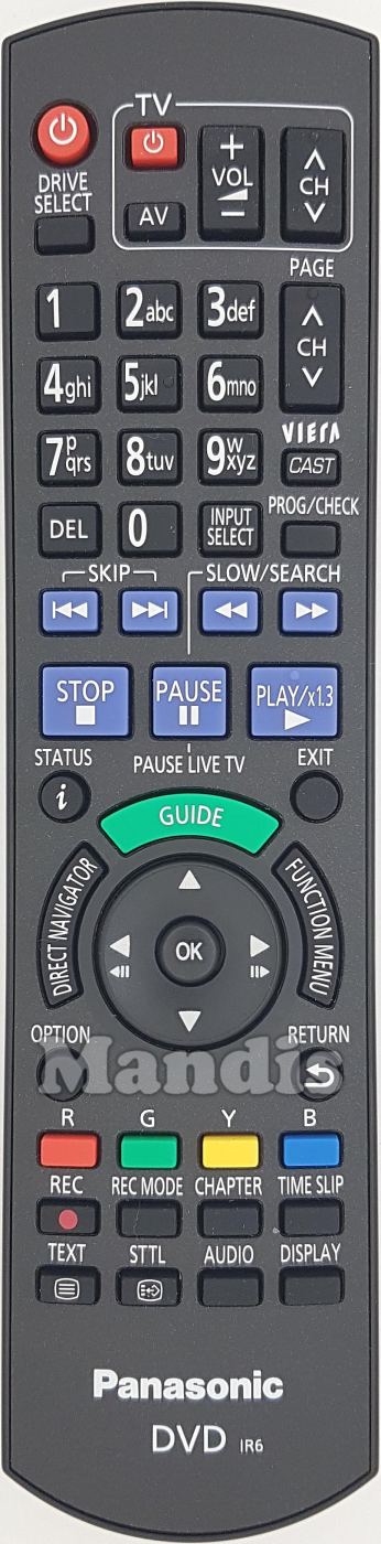 Power, Drive Select, TV Power, TV AV, TV Vol +, TV Vol -, TV CH +, TV CH -, 1, 2, 3, 4, 5, 6, 7, 8, 9, 0, CH + / Page +, CH - / Page -, CAST / Viera, Del, Input Select, Prog / CHeck, I<< Skip, >>I Skip, << Slow/Search, >> Slow/Search, Stop, Pause / Pause Live TV, Play / x 1.3, i / Status, Exit, Guide, Direct Navigator, Function Menu, Up, Down, Right, Left, OK, Option, Return, Red, Green, Yellow, Blue, Rec, Rec Mode, Chapter, Time Slip, Text, STTL, Audio, Display
