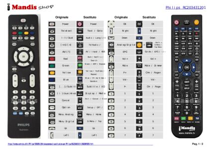 Questo telecomando esegue tutte le funzioni del telecomando originale: Power, Teletext, Dual I / II, , AV, Red, Geen, Yellow, Blue, Subtitle, Dual Window, Cancel, Option, Menu Analog, Menu Digital, Up, Right, Down, Left, OK, Analog / Digital, EPG, Vol +, Vol -, Mute, P +, P -, 1, 2, 3, 4, 5, 6, 7, 8, 9, 0, Info, P<P / Back, Ambilight ON/OFF, Ambilight Mode, Sound, Picture