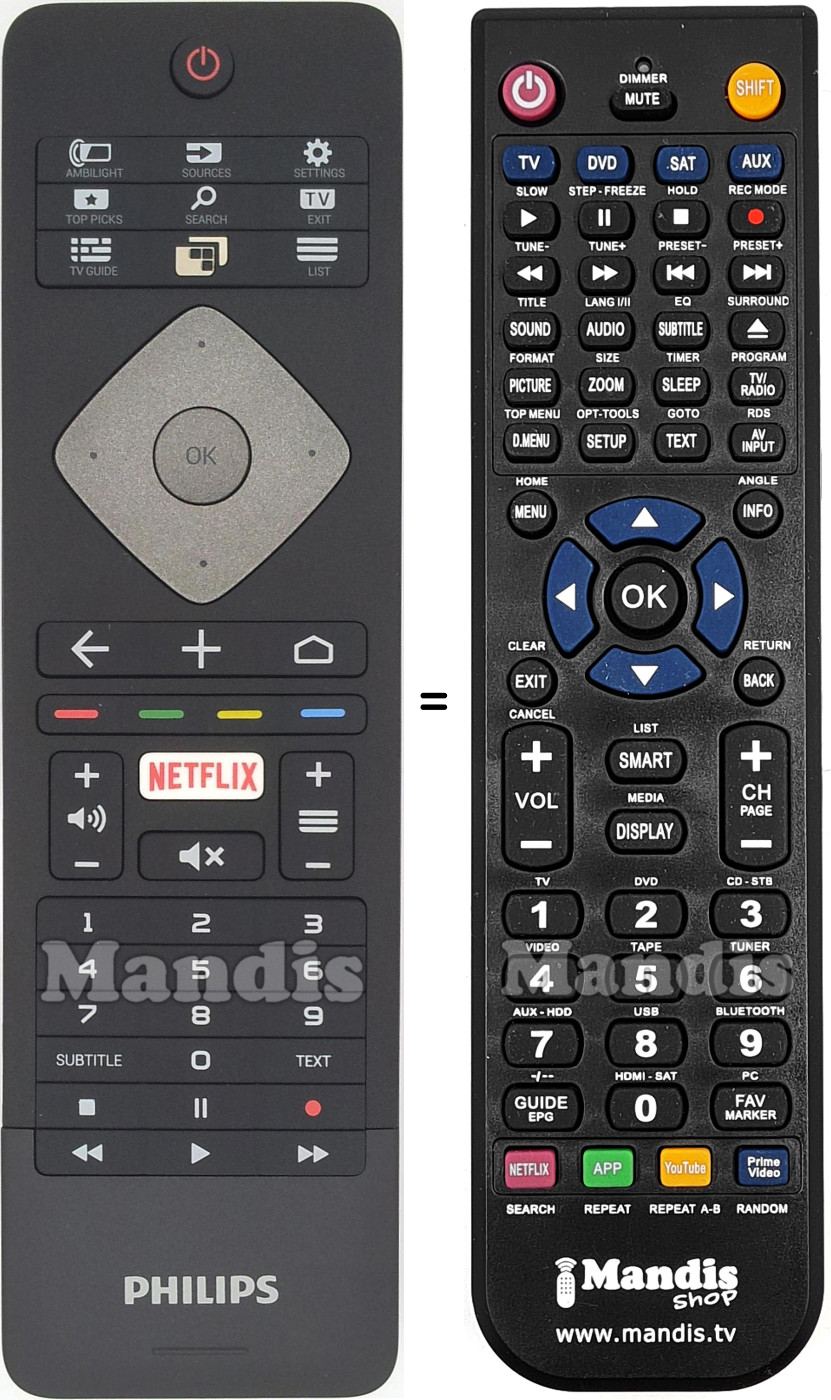 POWER, AMBILIGHT, SOURCE, SETTINGS, TOP PICKS, SEARCH, TV/EXIT, TV GUIDE, WINDOWS, LIST, OK, UP, DOWN, RIGHT, LEFT, ←, +, ⌂, RED, GREEN, YELLOW, BLUE, VOL+, VOL-, =+, =-, NETFLIX, MUTE, 1, 2, 3, 4, 5, 6, 7, 8, 9, 0, SUBTITLE , TEXT, STOP, PAUSE, REC, <<, PLAY, >>