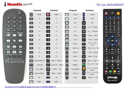 Questo telecomando esegue tutte le funzioni del telecomando originale: Power, 1, 2, 3, 4, 5, 6, 7, 8, 9, Resume/Return, Display, Disc Menu, System Menu, 0, Up, Down, Right, Left, OK, I<<, >>I, Play, Stop, Pause, Subtitle, Angle, Zoom, Audio, Repeat, A-B Repeat, Shuffle, Scan