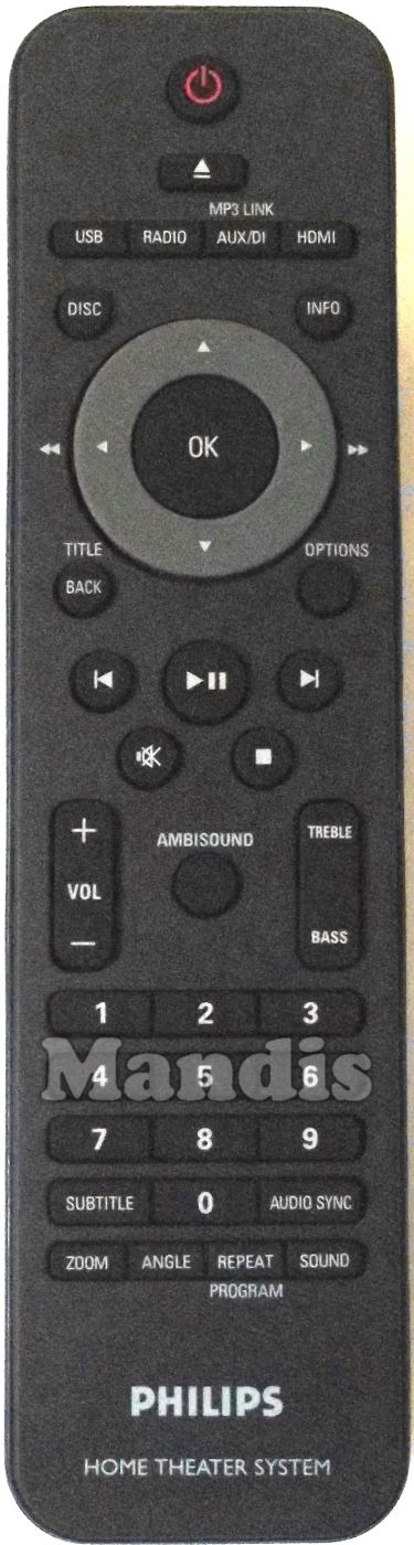 Power, Eject, USB, Radio, AUX / DI / MP3 Link, HDMI, Disc, Info, Up, Down, Right / >>, Left / <<, OK, Back / Title, Options, I<, >I, Play / Pause, Mute, Stop, Vol +, Vol -, Ambisound, Treble, Bass, 1, 2, 3, 4, 5, 6, 7, 8, 9, 0, Subtitle, Audio Sync, Zoom, Angle, Repeat / Program, Sound