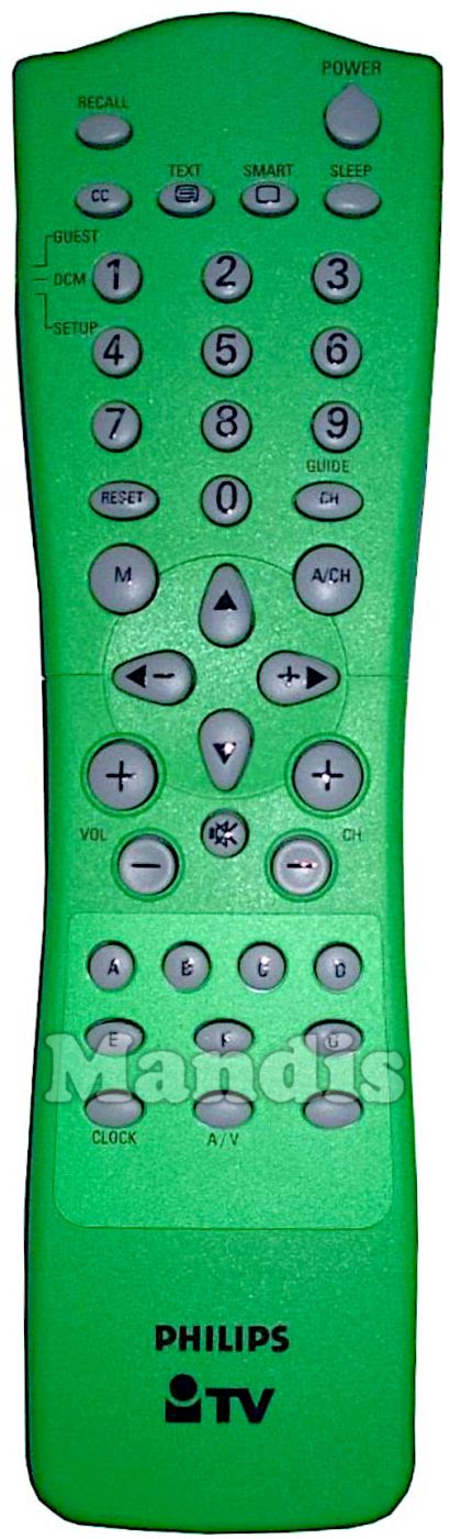 Power, Recall, CC, Text, Smart, Sleep, 1, 2, 3, 4, 5, 6, 7, 8, 9, 0, Reset, CH / Guide, M, A / CH, Up, Left / -, Right / +, Down, Vol+, Vol-, Mute, CH+, CH-, A, B, C, D, E, F, G, Clock, A / V,