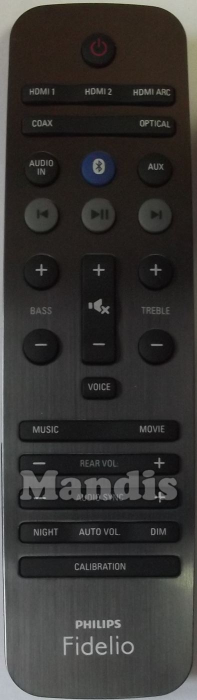 Power, HDMI1, HDMI2, HDMI ARC, Coax, Optical, Audio In, Bluetooth, AUX, I<, Play/Pause, >I, Bass+, Bass-, Treble+, Treble-, Vol+, Mute, Vol-, Voice, Musiv, Movie, Rear Vol-, Rear Vol+, Audio Sync+, Audio Sync-, Nigt, Auto Vol, DIM, Calibration