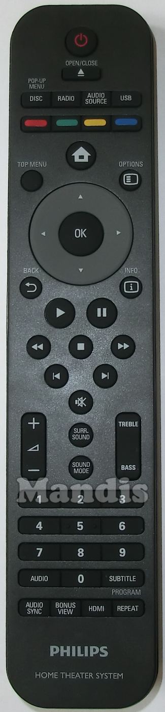 Power, Open/Close, Disc/Pop Up Menu, Radio, Audio Source, USB, Red, Green, Yellow, Blue, Home, Top Menu, Options, Back, Info, OK, Up, Down, Right, Left, Play, Pause, <<, Stop, >>, I<, >I, Mute, Surr. Sound, Sound Mode, Vol+, Vol-, Treble, Bass, 1, 2, 3, 4, 5, 6, 7, 8, 9, Audio, 0, Subtitle/program, Audio Sync, Bonus View, HDMI, Repeat