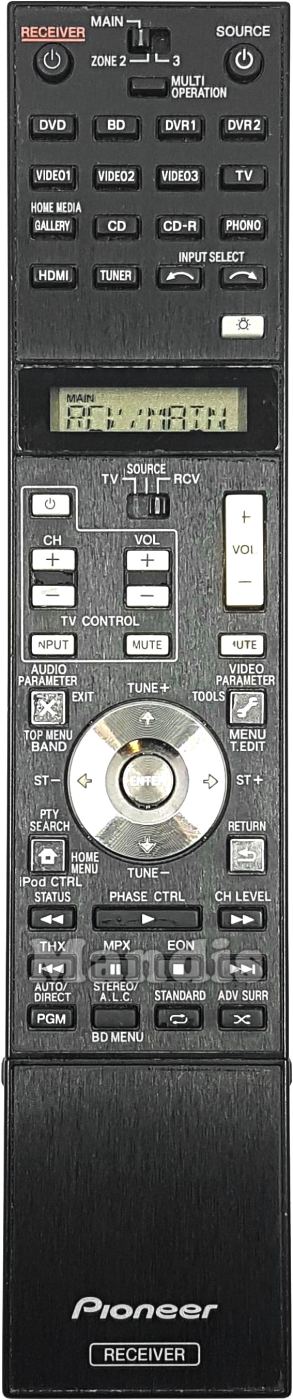 Power Receiver, Power Source, DVD, BD, DVR1, DVR2, VIDEO1, VIDEO2, VIDEO3, TV, Gallery / Home Media, CD, CD-R, PHONO, HDMI, TUNER, Input Select-, Input Select+, Bulb, TV CH+, TV CH-, TV Power, TV Vol+, TV Vol-, TV Mute, TV Input, Vol+, Vol-, Audio Parameter / Exit / Top Menu / Band, Video Parameter / Tools / Menu / T.Edit, Mute, PTY Search / Home Menu / iPod CTRL, Return, Up / Tune+, Down / Tune-, Right / ST+, Left / ST-, Enter, Status / <<, Phase Ctrl / Play, CH Level / >>, THX / I<<, MPX / Pause, EON / Stop, >>I, Auto / Direct / PGM, Stereo / A.L.C. / BD Menu, Standard / Repeat, ADV Surr / Random, Signal Sel / 1, Sleep / 2, Dimmer / 3, SR+ / 4, SBch / 5, MCACC / 6, A.Att / 7, Genere / 8, HDMI Out / 9, 0, CLR / D.Access, Class / Enter, Audio, Disp, CH+, CH-