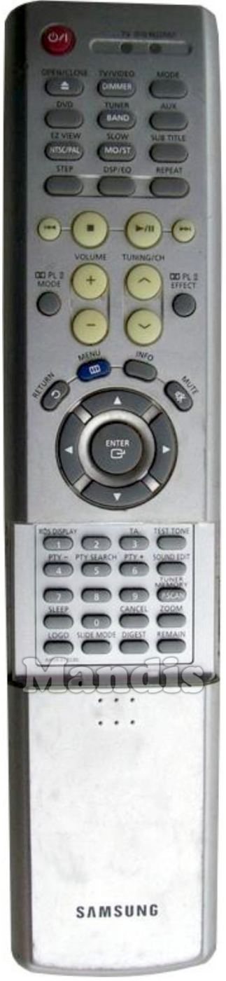 Power, Open / Close, Dimmer / TV/Video, Mode, DVD, Tuner / Band, Aux, NTSC/PAL / EZ View, Mo/St / Slow, Sub Title, Step, DSP / EQ, Repeat, I<<, Stop, Play / Pause, >>I, PL II Mode, Volume +, Volume -, Tuning + / CH +, Tuning - / CH -, PL II Effect, Return, Menu, Info, Mute, Up, Right, Down, Left, Enter, 1 / RDS Display, 2, 3 / TA, 4 / PTY -, 5 / PTY Search, 6 / PTY +, 7, 8, 9, 0, Sleep, Cancel, Test Tone, Sound Edit, P.Scan / Tuner Mem., Zoom, Logo, Slide Mode, Digest, Remain